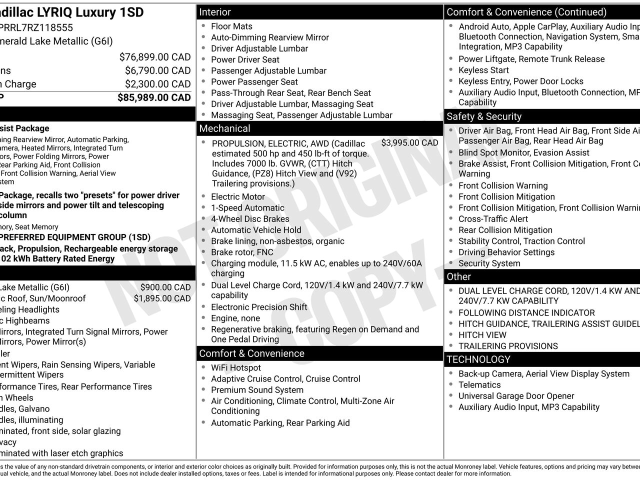 3 years of OnStar & Connected Services Plan Includes access to OnStar Safety & Security Services and Connected Services. For eligible retail customers, this includes the OnStar Guardian app, Remote Access through the myCadillac mobile app and a 180GB/3-year (whichever comes first) data plan for use with the vehicle's Wi-Fi hot spot and select vehicle apps. (3 years begins from the date of vehicle delivery. OnStar and Connected Vehicle Services require a working vehicle electrical system (including battery), active service plan, cell reception and GPS satellite signal. OnStar links to emergency services. Services, connectivity and capabilities vary by model and/or vehicle configuration and conditions as well as geographical and technical restrictions and are subject to terms and limitations. See onstar.ca for coverage maps, terms, details and system limitations. Data plans are provided by AT&T or its local service provider; availability subject to change; not transferable to subsequent vehicle owners. Non-refundable and no cash value.)