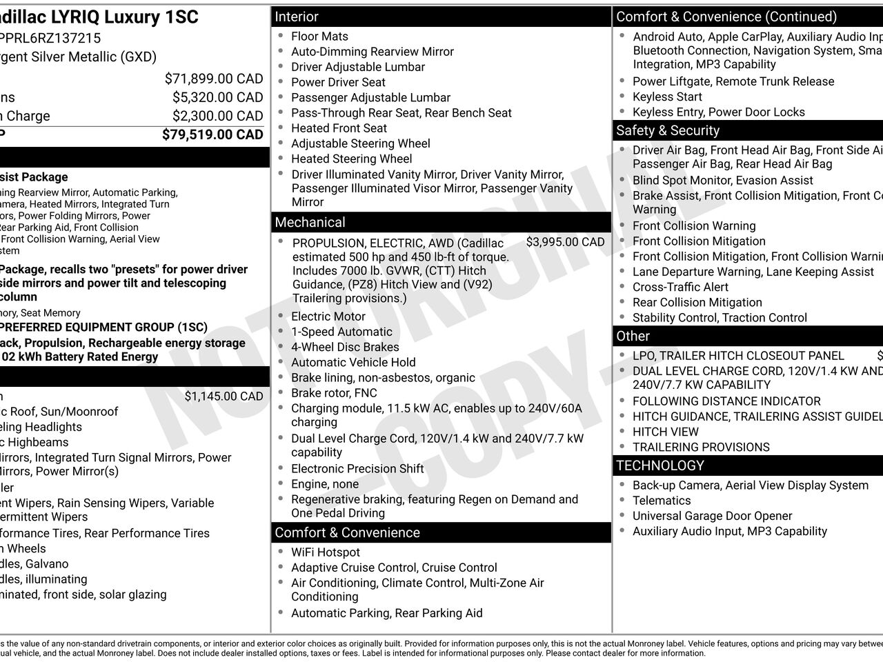 Abonnement de 3 ans à Onstar et aux Services connectés, comprend accès aux services Sain et sûr d'OnStar et aux Services connectés. Les clients de détail admissibles bénéficient de l'application OnStar Guardian et du service Accès à distance par l'entremise de l'application mobile myCadillac, ainsi que d'un forfait de données de 180 Go/3 ans (selon la première éventualité) à utiliser avec le point d'accès sans fil du véhicule et certaines applications du véhicule. (La période de 3 ans débute à la date de livraison du véhicule. Les services OnStar et les Services connectés requièrent un système électrique fonctionnel (y compris la batterie), un forfait de service actif, la réception de données cellulaires et un signal satellite GPS. Le système OnStar donne accès aux services d'urgence. Les services, la connectivité et les capacités varient selon le modèle ou la configuration du véhicule, les conditions ainsi que les restrictions géographiques et techniques, et sont assujettis à certaines conditions et restrictions. Consultez le site onstar.ca pour connaître les régions desservies, les modalités, les limitations et les détails liés au système. Les forfaits de données sont offerts par AT&T ou son fournisseur local; la disponibilité est sujette à modification; le plan de services ne peut être transféré aux propriétaires suivants. Non remboursable et sans valeur monétaire.)